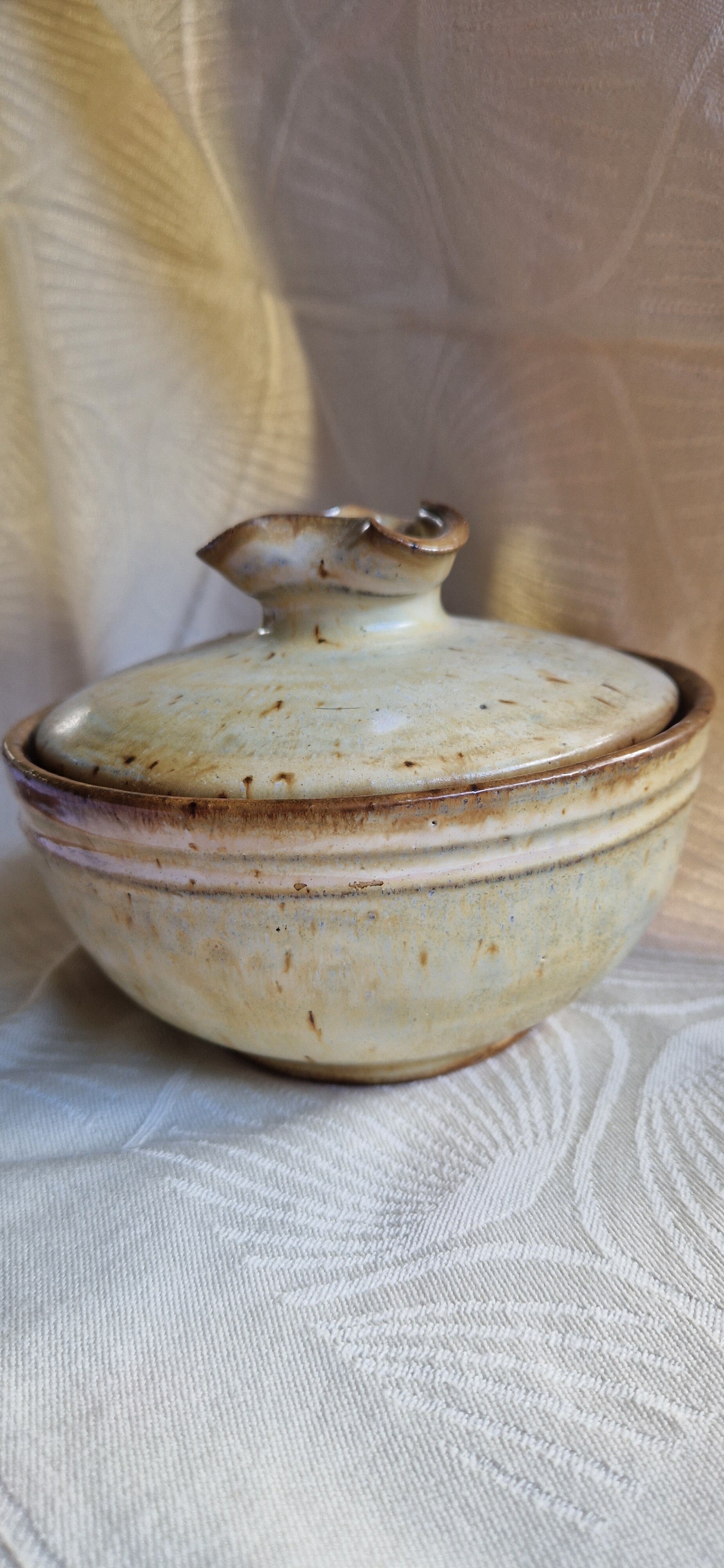 Pot met deksel, Frans aardewerk beige gespiekeld, keramiek uit de Provence, gedateerd 1980.