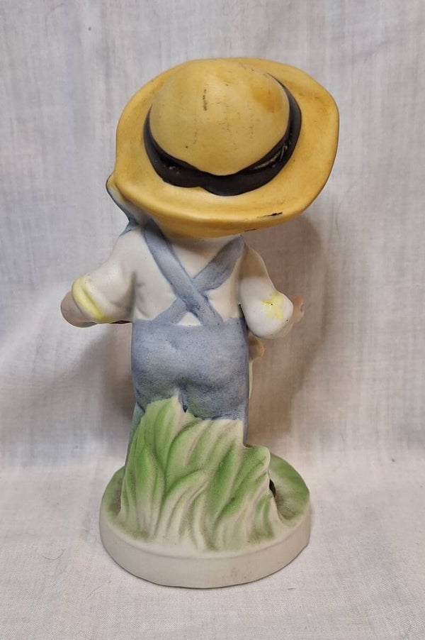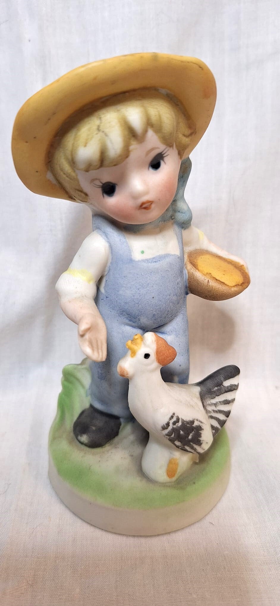 vintage beeldje van een jongetje/tuinman in blauwe overall die een kip eten geeft.