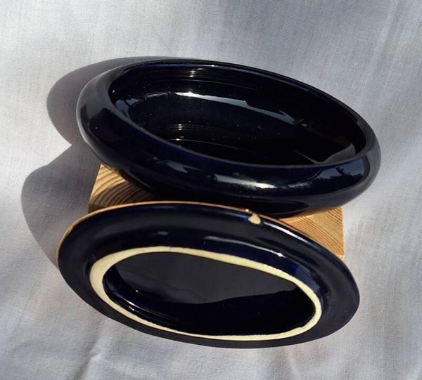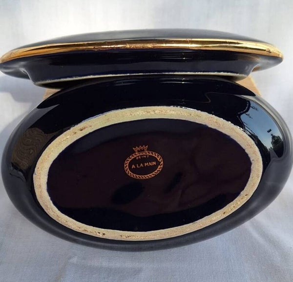 Ovaal porseleinen kobaltblauw snuisterijdoosje met prachtige gouden details. Limoges France.